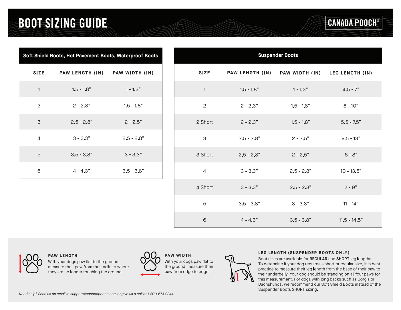 Available in regular and short leg lengths to ensure a secure fit across a wide range of dog sizes. Based on our research and fitting sessions, we found the SHORT leg length best for dog breeds such as Pugs, French Bulldogs, and Beagles and the REGULAR leg length best for dog breeds such as Poodles, Doodles, Golden Retrievers, and Dobermans. For dogs with long backs such as Corgis and Dachshunds, we recommend our Soft Shield Boots instead of the Suspender Boots SHORT sizing. Every dog’s size is different, so we recommend you measure your dog and refer to the Size Chart to determine your dog’s size.